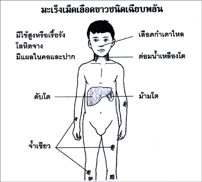 * อาการต่อมน้ำเหลืองโต (มีก้อนบวมที่บริเวณคอ รักแร้ ขาหนีบ) ซึ่งอาจตรวจพบในผู้ป่วยมะเร็งเม็ดเลือดขาวเฉียบพลัน อาจเกิดจากมะเร็งชนิดอื่นๆ (เช่น มะเร็งช่องคอ มะเร็งต่อมน้ำเหลือง)