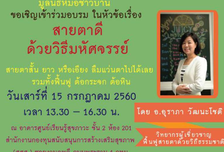 มูลนิธิหมอชาวบ้าน ขอเชิญเข้าร่วมอบรม ในหัวข้อเรื่อง “สายตาดีด้วยวิธีมหัศจรรย์” สายตาสั้น ยาว หรือเอียง ลืมแว่นตาไปได้เลย รวมทั้วฟี้นฟู ต้อกระจก ต้อหิน โดย อาจารย์อุราภา วัฒนะโชติ วิทยากรผู้เชี่ยวชาญฟื้นฟูสายตาด้วยวิถีธรรมชาติ
