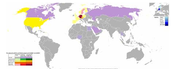ภาพแสดง ประเทศที่มีการระบาดของเชื้อ อี โคไล โอ ๑๗๔