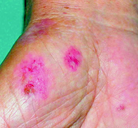 ชายไทยคู่ อายุ 65 ปี ภูมิลำเนาจังหวัดนนทบุรี สังเกตพบผื่นแดงคันหนาๆ 2 ตำแหน่ง ที่ฝ่ามือขวา (ภาพที่ 1) มา 1 ปี ทายาดีขึ้นบ้าง บางครั้งมีหนองซึมร่วมกับอาการเจ็บซึ่งตอบสนองต่อการรักษาบ้าง แต่เป็นผื่นตลอดไม่หาย. ในอดีตผู้ป่วยกินยาหม้อในช่วงวัยเด็กและวัยรุ่นเพื่อรักษาโรคสะเก็ดเงิน. ผู้ป่วย เคยมารักษาที่สถาบันโรคผิวหนังด้วยโรคมะเร็งผิวหนังชนิด Squamous cell carcinoma ที่ไหล่ซ้าย เมื่อ 4 ปีก่อนจนหายดี. ปัจจุบันผู้ป่วยไม่ได้ทำงานประจำใดๆ ชอบอ่านหนังสือและอยู่ในร่มเป็นส่วนใหญ่
