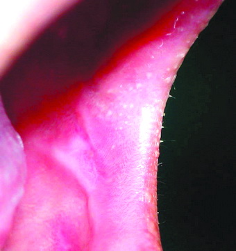 ภาพที่ 2. เม็ดตุ่มเล็กๆ ที่เยื่อบุกระพุ้งแก้มของผู้ป่วยรายที่ 2.