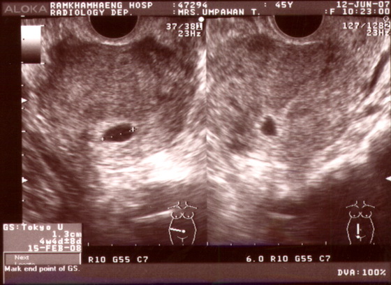 2. ปรากฏเงาคล้ายถุงน้ำในโพรงมดลูกขนาด 1 ซม. คำนวณเข้าได้กับการตั้งครรภ์ประมาณ 4 สัปดาห์ 4 วัน ไม่ปรากฏเงาคล้ายตัวเด็กหรือจุดการตั้งครรภ์ ที่จะเจริญไปเป็นตัวเด็ก.
