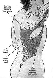 LD muscle มีลักษณะเป็นแผ่นแบนราบ รูปคล้ายสามเหลี่ยม มี origin จาก spines of the lumbar และ sacral vertebrae และ insertion ที่ intertubular groove of the humerus (ภาพที่ 9,10) หลอดเลือดที่มาเลี้ยงมาจาก thoracodorsal artery และจาก multiple segmental perforators of the lumbar intercostal arteries11 ซึ่งหลอดเลือดเหล่านี้ให้แขนง musculocu- taneous perforating vessels ทะลุ subcutaneous tissue เพื่อเลี้ยงผิวหนังที่อยู่เหนือกล้ามเนื้อทั้งหมด (ภาพที่ 11).