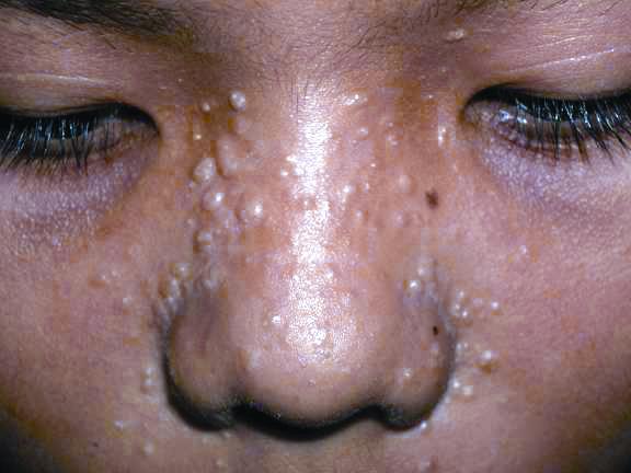 หญิงไทยโสด อายุ 27 ปี ภูมิลำเนาจังหวัดสระบุรี มีประวัติเป็นตุ่มนูนที่ใบหน้าบริเวณรอบจมูก (ภาพที่ 1) ตั้งแต่อายุ 19 ปี จำนวนมากขึ้นเรื่อยๆ ไม่มีอาการเจ็บปวดใดๆ เคยไปตรวจรักษาที่คลินิกเอกชน แพทย์ว่าเป็นสิวให้ยาทา อาการไม่ดีขึ้นมีเฉพาะบางตุ่มแบนลง. ผู้ป่วยไม่มีอาการผิดปกติทางระบบประสาท ไม่มีผื่นนูนตามตัว สีผิวหนังปกติ เล็บมือเล็บเท้าปกติดี.