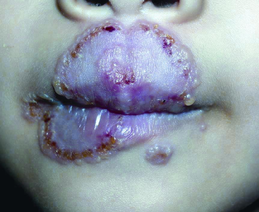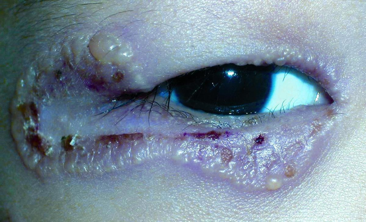 เด็กหญิงอายุ 6 ปี มีตุ่มน้ำขนาด 1-3 มม. รอบปากและรอบดวงตามานาน 3 เดือน. ตุ่มน้ำเรียงตัวเป็นวงมีตุ่มน้ำใสเล็กขึ้นรอบๆ ลามและกระจายไปตามร่างกายช้าๆ ดังภาพที่ 2 และ 3. สุขภาพโดยทั่วไปแข็งแรงดี.