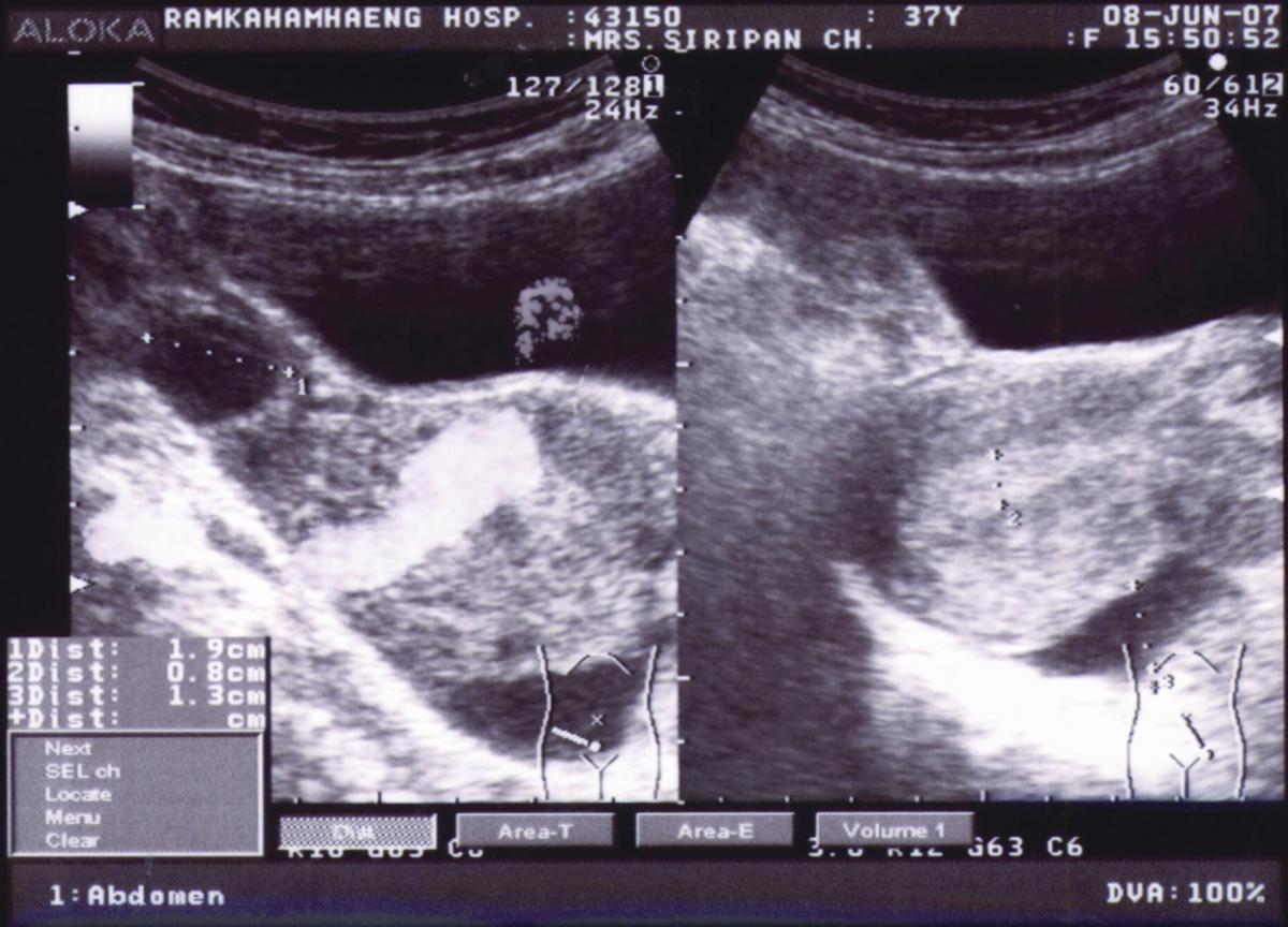 2. เงามดลูกมีขนาดปกติ แต่บ่งชี้เยื่อบุมดลูกหนาประมาณ 0.8 ซม.และปรากฏเงาของเหลวในช่องเชิงกรานหนาประมาณ 1.3 ซม.