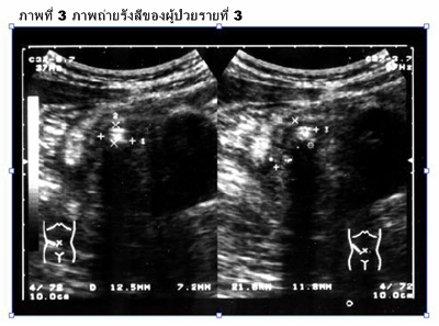หญิงไทยโสด อายุ 21 ปี มีอาการปวดท้องบริเวณ epigastrium นาน 6 ชั่วโมง ผู้ป่วยเริ่มมีอาการท้องเสียและปวดท้องย้ายมาบริเวณมุมขวาล่างของช่องท้อง. การตรวจร่างกายพบมี local tenderness และมี rebound tenderness. การส่งตรวจปรากฏลักษณะดังภาพที่ 3.