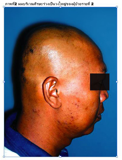 ชายไทยคู่ อายุ 44 ปี มีประวัติเส้นผมที่ศีรษะร่วงอย่างรวดเร็ว เริ่มจาก 2 เดือนก่อนมีอาการเจ็บหนังศีรษะเล็กน้อย. ต่อมาสังเกตพบผมร่วงเป็นวงขนาดเหรียญ 10 บาท 2-3 แห่งแล้วลามออกเป็นวงใหญ่ขึ้น (ภาพที่ 2) เมื่อจับหรือสระผมเส้นผมจะหลุดร่วงเป็นจำนวนมาก สังเกตว่าเส้นขนที่คิ้ว ขนตาและขนรักแร้หลุดร่วงด้วย. ผู้ป่วยใช้แชมพูขจัดรังแคหลายชนิดสลับกัน สระผมวันเว้นวัน.