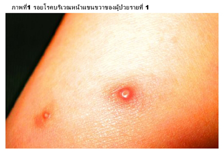 ชายอายุ 38 ปี แข็งแรงดี สังเกตพบตุ่มแดงที่แขนขวามานาน 1 สัปดาห์ ตุ่มค่อยๆ โตขึ้น ไม่คัน ไม่มีไข้หรืออาการอื่นร่วมด้วย. การตรวจร่างกายพบรอยโรคที่หน้าแขนขวาดังภาพที่ 1.