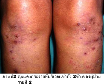 หญิงไทยคู่ อายุ 43 ปี มีตุ่มแดงกดเจ็บเล็กน้อย ไม่คัน กระจายบริเวณเข่า (ภาพที่ 2) และศอกทั้ง 2 ข้างมาประมาณ 8 เดือน จำนวนตุ่มแดงปรากฏมากขึ้นเรื่อยๆ. เมื่อเวลาผ่านไปตุ่มแดงนี้ตรงกลางกลายเป็นสะเก็ดดำ เมื่อสะเก็ดหลุดกลายเป็นแผลเป็นหลุมตื้นๆ.