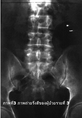 ชายอายุ 70 ปี รายงานว่าปวดหลังมากมานาน 2 เดือน. 1 เดือนก่อนมาโรงพยาบาลอาการปวด มากขึ้นโดยเฉพาะเวลากลางคืน. การตรวจภาพถ่ายทางรังสีปรากฏผลดังภาพที่ 3.