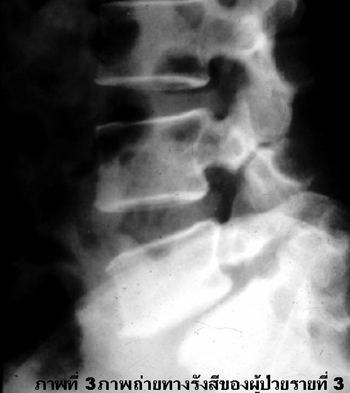 ชายไทยคู่อายุ 45 ปี รู้สึกปวดหลังมานาน 2 ปี ปวดมากขึ้นเรื่อยๆ โดยเฉพาะเวลายกของหนัก. ผู้ป่วยทำงานยกของหนัก. 1 เดือนมานี้อาการปวดรุนแรงมากขึ้นเรื่อยๆ. การตรวจทางรังสีปรากฏดังภาพที่ 3.