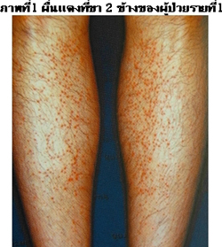 ชายอายุ 35 ปี สังเกตพบผื่นแดงที่ขา 2 ข้าง (ภาพที่ 1) มานาน 2 สัปดาห์. ผู้ป่วยรายงานว่าตนสุขภาพแข็งแรง.การตรวจร่างกายพบ erythematous papules อยู่ที่โคนเส้นขนบริเวณหน้าแข้ง 2 ข้างรู้สึกระคายเคือง คัน และเจ็บเล็กน้อย.