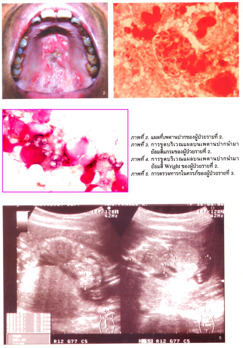 ชายอายุ 39 ปี มาด้วยแผลเจ็บที่เพดานปากมา 2 เดือน เบื่ออาหารและน้ำหนักลด 10 กก.2 สัปดาห์ก่อนมาบแพทย์ตรวจพบว่ามีฝ้าขาวในปาก มีแผลขนาดใหญ่ที่เพดานปากได้รับยา fluconazole วันละ 200 มก.นาน 14 วัน. วันนี้มาตรวจพบว่าฝ้าขาวในปากหายหมด แต่แผลที่เพดานปากไม่ดีขึ้นและยังเจ็บเหมือนเดิม (ภาพที่ 2)ได้ทำการขูดบริเวณแผลบนเพดานปากนำมาย้อมสีแกรม(ภาพที่ 3)และย้อมสี Wright (ภาพที่4).