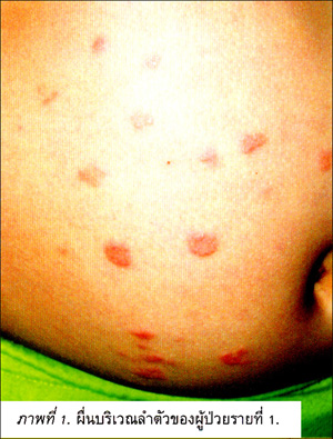 เด็กหญิง อายุ 3 ปี 3 เดือน มารดาสังเกตพบผื่นที่มือ ขา ท้อง (ภาพที่ 1) มา 2 เดือน การทายาสตีรอยด์ คือ เดอร์โมเวทครีม แล้วไม่ดีขึ้น. การตรวจร่างกายพบ ปื้นวงกลมสีแดงอ่อนขอบนูนแข็งเท่ายางลบ หลายตำแหน่งกระจัดกระจายบริเวณมือ, แขน, ขา และลำตัว. ผลการตรวจทางจุลพยาธิชิ้นเนื้อพบ lymphocytes แทรกอยู่รอบหลอดเลือดและ interstitium ร่วมกับการสะสมของสาร mucin โดยปรากฏในชั้นตื้นและชั้นลึกของผิวหนัง.