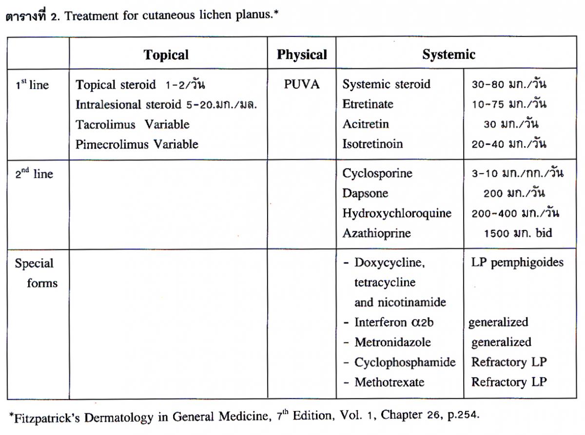 4. การรักษา ส่วนใหญ่ใช้การทายาสตีรอยด์ฤทธิ์ปานกลางถึงแรงมาก ซึ่งต้องพิจารณาผลดีและผลข้างเคียงของยาด้วย ในบางรายอาจใช้การฉีดสตีรอยด์หรือทายากลุ่ม calcineurin inhibitor ในรายที่เป็นกระจายอาจฉายแสง PUVA หรืออาจใช้ยากินตามตารางที่ 2 ซึ่งต้องพิจารณาตามความจำเป็นและเหมาะสมเป็นรายๆ ไป.