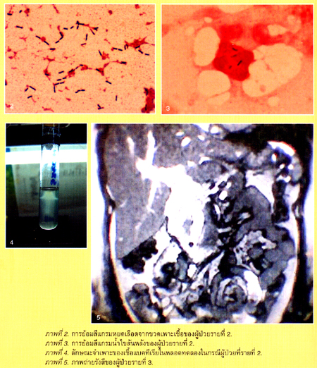 ชายอายุ 50 ปี อยู่ระหว่างการรักษาโรคมะเร็งเม็ดเลือดขาวชนิด multiple myeloma ด้วยยาเคมีบำบัด. ผู้ป่วยมาด้วยไข้สูงหนาวสั่น 1 วัน. การตรวจร่างกายพบไข้ 40๐ซ. ความรู้สึกตัวดี, ไม่ปวดศีรษะ, ไม่มีคอแข็ง (stiffness of neck), ผลการตรวจร่างกายระบบอื่นๆ อยู่ในเกณฑ์ปกติ ผลการส่งเลือดเพาะเชื้อแบคทีเรีย พบแบคทีเรียขึ้นในเลือดที่ส่งตรวจทั้ง 2 ขวดในเวลาห่างกัน 16 ชั่วโมง และการย้อมสีแกรม (gram stain) หยดเลือดจากขวดเพาะเชื้อ พบลักษณะดังภาพที่ 2. การตรวจวิเคราะห์องค์ประกอบน้ำหล่อสมองและไขสันหลังพบ WBC 1,130 เซลล์/มล. PMN 64%, L36%, โปรตีน 168 มก./ดล., น้ำตาลกลูโคส 41 มก./ดล. โดยที่น้ำตาลกลูโคส ในเลือดเท่ากับ 124 มก./ดล. ผลการย้อมสีแกรมน้ำไขสันหลัง พบลักษณะดังภาพที่ 3. ภาพที่ 4 แสดงลักษณะจำเพาะของเชื้อแบคทีเรียชนิดนี้ในหลอดทดลองที่ทดสอบการเคลื่อนที่ของเชื้อแบคทีเรียในห้องปฏิบัติการ.