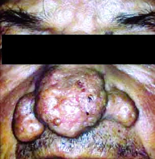 Adenoma sebaceum ตุ่มเนื้องอกชนิดนี้มีลักษณะเป็นเม็ดสีน้ำตาลแดงใสมันใส ถ้าดูใกล้ๆ อาจพบหลอดเลือดฝอยขนาดเล็กจำนวนมากมาย. ตุ่มเนื้องอกชนิดนี้มักพบตามร่องข้างแก้ม แก้ม และคาง และยังอาจพบได้ตามหน้าผาก (ภาพที่ 20) หนังศีรษะและใบหู อาจเกิดร่วมกับกลุ่มอาการ tuberous sclerosis ซึ่งประกอบด้วยเนื้อเยื่อคอลลาเจนที่หนาและมีขนาดใหญ่ขึ้น เรียกว่า shagreen patch. รอยด่างขาวรูปร่างคล้ายใบไม้ตามตัว (ash leaf) แคลเซียม เกาะในสมอง เนื้องอกในตา ไต กระดูก และฟันผิดปกติ เป็นต้น. ในหญิงเจริญพันธุ์พบ pulmonary lymphangiomyoma โรคนี้ถ่ายทอดทางพันธุกรรมแบบ autosomal dominant พบว่ามากกว่าร้อยละ 60-70 ของผู้ป่วยกลุ่มอาการนี้สติปัญญาอ่อน และร้อยละ 80-90 มีอาการชัก จึงต้องถ่ายภาพเอกซเรย์สมอง และถ่ายภาพเอกซเรย์คอมพิวเตอร์ตามความจำเป็นในแต่ละราย. รักษาอาการชักและรับคำแนะนำในด้านการวางแผนครอบครัว เพราะพ่อหรือแม่ที่เป็นโรคนี้ หากมีลูกไม่ว่าจะเป็นชายหรือหญิง ร้อยละ 50 มีโอกาสเกิดกลุ่มอาการนี้. ส่วนในแง่ cosmetic อาจตัดตุ่มเหล่านี้ออกโดยใช้จี้ด้วยไฟฟ้า ใช้เลเซอร์ หรือการขัดผิวหนัง.