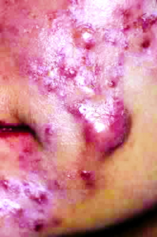 ► Pyoderma faciale หรือ rosacea fulminans โรคสิวประเภทนี้พบเฉพาะในเพศหญิง อายุระหว่าง 20-40 ปี มีลักษณะเฉพาะคือ มี nodules ขนาดใหญ่ที่เจ็บ, ตุ่มหนอง และมีแผลที่อาจก่อแผลเป็น (ภาพที่ 16). โรคนี้เกิดขึ้นอย่างรวดเร็วและอาจพบในผู้หญิงที่ไม่เคยเป็นสิวมาก่อน เป็นเฉพาะที่ ใบหน้า ไม่เกี่ยวกับภาวะหน้ามัน มักไม่เป็นนานเกิน 1 ปี อาการอาจกำเริบเลวลงได้อย่างรวดเร็ว.