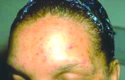 ภาพที่ 3. สิวจากเครื่องสำอาง. ภาพที่ 4. สิวจากน้ำมันใส่ผมที่หน้าผาก