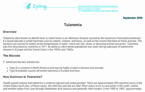เมื่อเร็วๆ นี้ ได้มีรายงานผู้ป่วยชาวไทยเป็นโรค tularemia นับเป็นรายแรกของประเทศไทย ผู้เขียน ได้ค้นหาเว็บไซต์ที่สร้างสำหรับเรื่องนี้โดยตรง แต่ยังไม่พบ จึงขอนำ factsheet ของ National Institute of Allergy and Infectious Diseases ของ NIH มานำเสนอแทน.