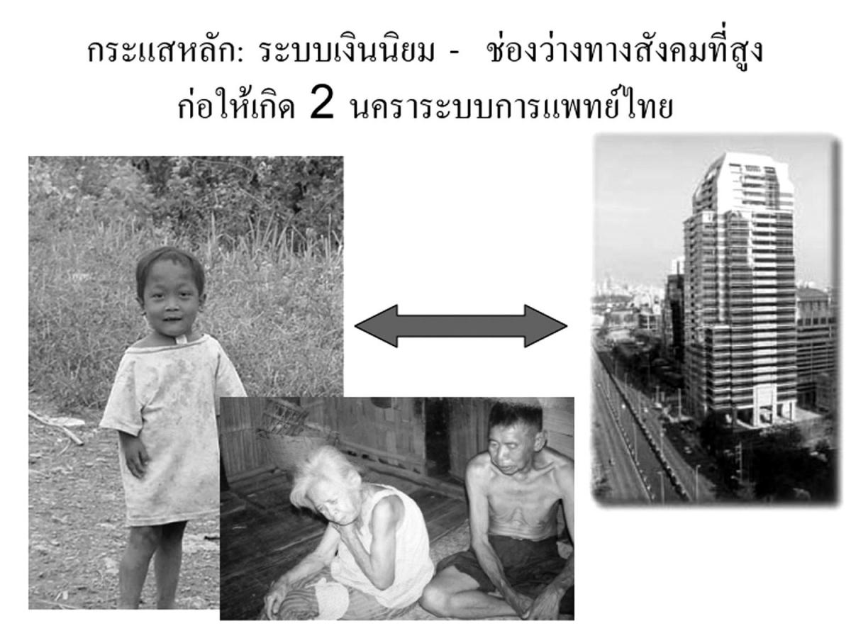 ทั้งปัญหางานหนัก ความซับซ้อนของระบบการแพทย์ที่บางครั้งผู้ป่วยเองก็ไม่อาจเข้าใจได้ง่าย ทำให้ผู้ป่วยและแพทย์ต่างมีความทุกข์และกลายเป็นเหยื่อของระบบสุขภาพที่ป่วย ระบบที่ทำให้มี 2 นคราระบบการแพทย์ไทย แต่อยู่ในระบบกฎหมายเดียวกัน ระบบหนึ่งเน้น หรูหรา ค่าตอบแทนแพทย์สูง ใช้ทรัพยากรไม่จำกัด อีกระบบหนึ่ง งานหนัก ค่าตอบแทนต่ำ ขาดแคลนคนและอุปกรณ์ แต่ในสังคมเดียวกัน มาตรฐานกฎหมายเดียวกัน การสื่อสารไร้พรมแดน ย่อมทำให้ความขัดแย้งเกิดขึ้นอย่างหลีกเลี่ยงไม่ได้.