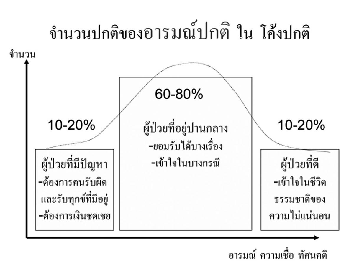 ในทางระบาดวิทยา ทั้งแพทย์และผู้ป่วยย่อมอยู่ในโค้งปกติ ที่มีทั้งแพทย์ที่ดีทั้งอารมณ์ EQ การดูแลรักษาเยียวยา (easy doctor) จนถึงแพทย์ที่มีปัญหาด้านอารมณ์ อาจจะเนื่องจากเป็นนิสัยส่วนตัว ควบคุมอารมณ์ไม่อยู่แม้ว่าจะพยายามแล้ว พูดหวานๆ ไม่ค่อยเป็น ไม่อยากมาเป็นแพทย์ตั้งแต่ต้น ขาดความรู้ หรือเหนื่อยเกินไป (difficult doctor). ผู้ป่วยก็ย่อมมีตั้งแต่ผู้ป่วยที่เข้าใจและยอมรับได้ยาก ต้องการคนรับผิด ต้องการเงินชดเชย อยากให้อีกฝ่ายต้องมีความทุกข์ด้วย (difficult patient) จนถึงผู้ป่วยที่ยอมรับได้ง่าย คิดถึงว่าเป็นเวรกรรม เข้าใจธรรมชาติของชีวิต (easy patient) ดังนั้นในเหตุการณ์ต่างๆเราอาจจะต้องยอมรับว่าในฐานะแพทย์เราอาจจะพบคนได้หลายแบบ เราคงต้องเตรียมพร้อมที่จะรับมือกับคนในทุกประเภทรวมทั้ง difficult patient ด้วย. ในขณะเดียวกันนั้น เราต้องฝึกฝนและพัฒนาตัวเองให้มีการดูแลทางอารมณ์ของเรา และ EQ ที่ดีขึ้นเรื่อยๆ ด้วย ยอมรับว่าในขณะที่เหนื่อย มีเวลาตรวจแค่ 3 นาที อาจจะทำให้เราไม่สามารถสื่อสารและดูแลอารมณ์ของ เราและผู้ป่วยได้เต็มที่ แต่เมื่อเราได้พยายามแล้ว สถานการณ์ต่างๆย่อมดีขึ้นได้ ทั้งนี้ทั้งนั้นไม่ได้แปลว่าแพทย์ที่มีความขัดแย้งกับผู้ป่วย เป็นแพทย์/ผู้ป่วยที่ไม่ดี หรือด้อยความสามารถควบคุมอารมณ์ แต่การเข้าใจสถานการณ์ต่างๆ ซึ่งกันและกัน ย่อมทำให้สถานการณ์แห่งการสมานฉันท์เกิดขึ้นได้.