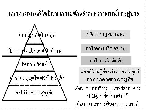 อย่างไรก็ดี การแก้ปัญหาคงไม่ใช่เริ่มที่ตัวแพทย์เองเท่านั้น ในระดับประเทศการแก้ไขวิกฤติความขัดแย้งระหว่างแพทย์กับผู้ป่วยมีได้หลายขั้นดังภาพที่ 1 แต่สิ่งแรกควรเริ่มด้วยการมีกองทุนชดเชยความเสียหายทางการแพทย์ ที่เกิดขึ้นทั้งจากเหตุสุดวิสัยและไม่สุดวิสัยก่อน เพื่อเยียวยาความทุกข์ร้อนของผู้ที่เสียเสาหลักในครอบครัวไป จริงที่ว่าแพทย์ไม่ผิด แต่ผู้ป่วย และญาติก็ไม่ผิดเช่นกัน ดังนั้นการเยียวยาด้วยกองทุนชดเชยให้ผู้เสียหายรู้สึกว่าเขาได้รับอะไรทดแทนไปบ้าง แม้จะไม่สามารถชดเชยกับชีวิตที่ไม่สามารถตีราคาได้ แต่ก็จะบรรเทาความทุกข์ในจิตใจไปได้ไม่มากก็น้อย.