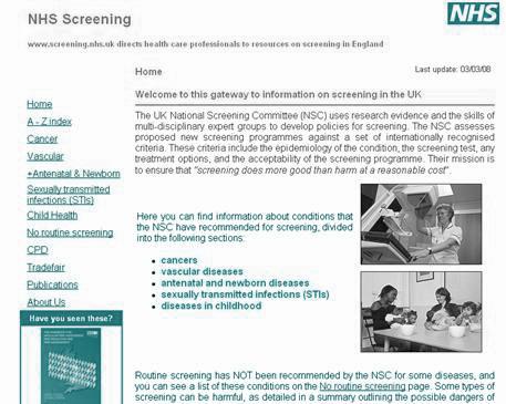 เริ่มจากรายการทางด้านซ้ายจะมี A- Z index ประกอบด้วยแนวทางการคัดกรอง โรคหรือภาวะต่างๆ ต่อด้วยโรคสำคัญบางโรค ที่แยกออกมาเช่น มะเร็ง (cancer) โรคหลอดเลือด (vascular) โรคติดต่อทางเพศสัมพันธ์ โรคในเด็ก และโรคหรือภาวะที่ไม่ต้องทำการตรวจคัดกรอง (no routine screeening) มีเอกสารที่ระบุการตรวจคัดกรองที่มีอันตรายมากกว่าประโยชน์ เช่น CT scan, MRI เป็นต้น. นอกจากนี้ ยังมีไฟล์ให้ดาวน์โหลดมากมาย ได้แก่ คู่มือความเสี่ยงของโรคหลอดเลือด การตรวจคัดกรองในระยะต่างๆ ของการตั้งครรภ์ การตรวจคัดกรองสำหรับมารดาและบุตร ซึ่งถึงแม้ว่าจะเป็นคำแนะนำจากประเทศอังกฤษ แต่ก็มีข้อมูลที่ใช้ได้กับประชากรไทยเช่นเดียวกัน.