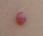Pyogenic granuloma จะมีขนาดเล็ก เฉลี่ยเส้นผ่าศูนย์กลาง 6.5 มม. พบน้อยมากในทารกอายุน้อยกว่า 6 เดือน พบมีแผลและสะเก็ดเกาะอยู่ เมื่อสะกิดมีเลือดออกได้ง่าย.