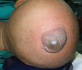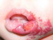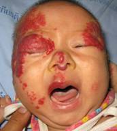 1. กลายเป็นแผล (ulceration) ใน hemangioma บนผิวหนังพบการเกิดแผลได้เองร้อยละ 5 แต่จะยิ่งเกิดได้บ่อยบริเวณที่เสี่ยงต่อการบาดเจ็บง่าย เช่น บริเวณริมฝีปาก อวัยวะเพศหรือบริเวณทวารหนัก และเป็นผลทำให้อวัยวะนั้นผิดรูปได้ (ภาพที่ 4).