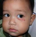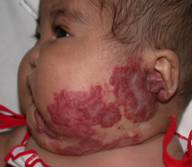 ลักษณะเป็นผื่นแบนราบสีแดง แต่บางรายผื่นอาจนูน (ภาพที่ 10) พบตั้งแต่แรกเกิดและอยู่ตลอดชีวิต มีทั้งขนาดเล็กจนถึงใหญ่มาก ส่วนมากไม่มีอันตราย แต่อาจมีผลด้านความสวยงาม ต้องแยกโรคจาก nevus flammeus neonatorum ที่จางหายได้เอง.