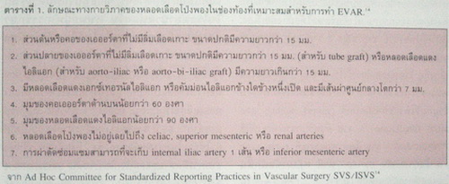 ความเหมาะสมสำหรับ EVAR ขึ้นอยู่กับลักษณะจำเพาะทางกายวิภาคศาสตร์ของหลอดเลือด13,14 ตามตารางที่ 1. จุดสำคัญที่สุดคือความยาวของหลอดเลือดปกติส่วนต้นและปลายต่อหลอดเลือดโป่งพอง ส่วนใหญ่แล้วหลอดเลือดโป่งพองจะอยู่เลยจุดแยก และลามลงไปถึงหลอดเลือดแดงไอลิแอก. ดังนั้นจึงพบว่า สำหรับ EVAR จะใช้ bifurcate device (aorto-biiliac) เป็นส่วนมาก ต่างจากการเปิดหน้าท้องผ่าตัดซ่อมหลอดเลือดโป่งพอง ซึ่งจะใช้ tube graft มากว่า เพราะสามารถเย็บต่อได้ที่ขอบผนังเอออร์ตาที่ติดกับรูเปิดของหลอดเลือดแดงคัมม่อนไอลิแอก.15