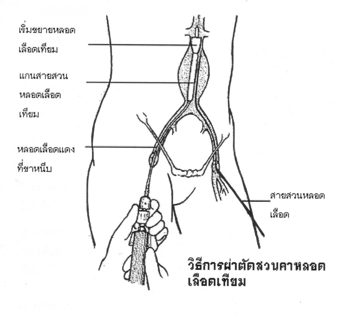 ภาพที่ 1. วิธีการผ่าตัดสวนคาหลอดเลือดเทียมผ่านขาหนีบ.