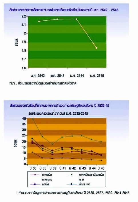ในภาพที่ 1 และ 2 แสดงให้เห็นแนวโน้มค่าใช้จ่ายด้านสุขภาพ ในปี พ.ศ. 2542- 2545 และครัวเรือนที่ยากจน ในช่วง 10 ปี ระหว่างปี พ.ศ. 2535-2545 ที่เป็นไปในทิศทางร่วมกันคือ ลดลงชัดเจนในปี พ.ศ. 2545 ซึ่งเป็นปีแรกในการดำเนินโครงการหลักประกันสุขภาพถ้วนหน้า