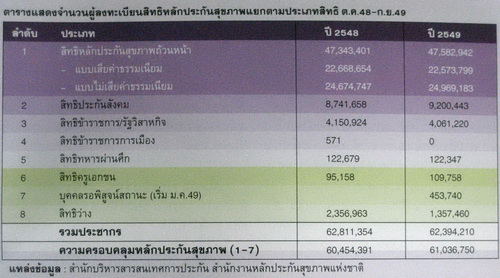 ณ เดือนกันยายน 2549 คนไทยร้อยละ 97.82 หรือ 61.04 ล้านคน (จากประชากรทั่วประเทศ 62.39 ล้านคน) มีหลักประกันสุขภาพ มีอัตราความครอบคลุมเพิ่มขึ้นร้อยละ 0.96 โดย 47.54 ล้านคนลงทะเบียนสิทธิหลักประกันสุขภาพถ้วนหน้า เพิ่มขึ้นจากปี 2548 ร้อยละ 0.42 ในจำนวนนี้เป็นสิทธิประกันสุขภาพแบบเสียค่าธรรมเนียม 22.57 ล้านคน และสิทธิประกันสุขภาพแบบไม่เสียค่าธรรมเนียมจำนวน 24.97 ล้านคน ที่น่าสนใจคือจำนวนประชากรที่มีสิทธิว่างลดลงถึงร้อยละ 42.41 จาก 2,356,963 คนในปี 2548 เหลือ 1,357,460 คนในปี 2549