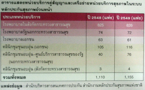 หน่วยบริการคู่สัญญาในระบบหลักประกันสุขภาพถ้วนหน้าในปี 2549 เพิ่มขึ้นจาก 1,110 แห่งในปี 2548 เป็น 1,155 แห่ง โดยเป็นกลุ่มโรงพยาบาลมากที่สุดร้อยละ 83.03 (959 แห่ง) อีกร้อยละ 16.97 เป็นกลุ่มคลินิกชุมชนอบอุ่น (196 แห่ง)