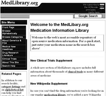 ในกรณีที่ค้นหาข้อมูลยาที่ต้องการไม่พบเว็บไซต์นี้ได้เพิ่ม New Wikipedia Supplement ซึ่ง Wikipedia เป็นสารานุกรมยอดนิยมแห่งหนึ่งที่นักท่อง net รู้จักกันดีอยู่แล้ว ซึ่งจะทำให้ได้ข้อมูลส่วนขาดที่ยังไม่พบใน http://medlibrary.org <