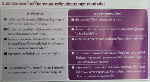 อย่างไรก็ตาม ข้อมูลจากประเทศต่างๆ ชี้ว่าการฟ้องร้องค่าเสียหายมีจุดอ่อนในหลายด้าน ทั้งทำลายสัมพันธ์ที่ดีระหว่างแพทย์กับผู้ป่วย เพราะนำไปสู่การเผชิญหน้า ไม่ไว้วางใจ นำไปสู่การปกปิดข้อมูล และขาดความจริงใจในการเผชิญหน้าและแก้ไขปัญหาความผิดพลาด นอกจากนี้ โอกาสที่ผู้ป่วยจะชนะคดีมีน้อย อีกทั้งวิธีการต่อสู้ทางศาลได้สร้างความเครียดทั้งสองฝ่าย และมีค่าใช้จ่ายสูง