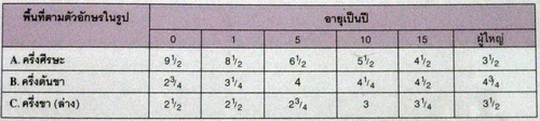 ภาพที่ 8. การอนุมานพื้นผิวร่างกายที่ถูกไฟไหม้/ลวก โดยใช้ Lund and Browder diagram ซึ่งจะคิดเป็นร้อยละของพื้นผิวร่างกายทั้งหมด แปรเปลี่ยนตามอายุเป็นปี (ตัวเลขคือ ร้อยละของพื้นผิวร่างกาย ส่วนตัวอักษรในรูป ให้ดูตามตารางข้างล่าง).