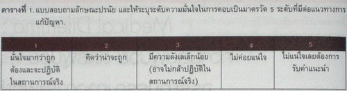 จากการสำรวจโดยให้แพทย์ประจำบ้านสาขาอายุรกรรม คณะแพทยศาสตร์ศิริราชพยาบาล ประจำปี การศึกษา 2550 จำนวน 70 คน ได้ทดลองตอบคำถามข้างต้นโดยใช้แบบสอบถามลักษณะปรนัย และให้ระบุระดับความมั่นใจในการตอบ เป็นมาตรวัด 5 ระดับ (ตามตารางที่ 1) ที่มีต่อแนวทางการแก้ปัญหาดังกล่าว