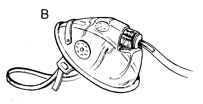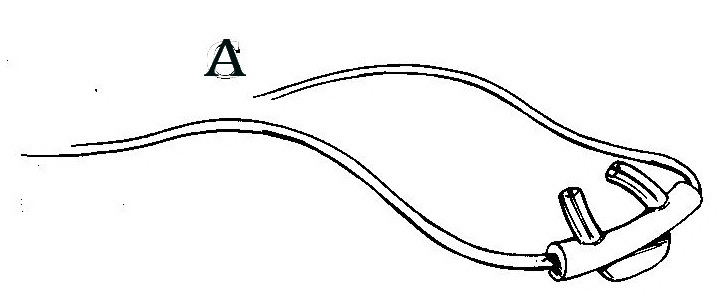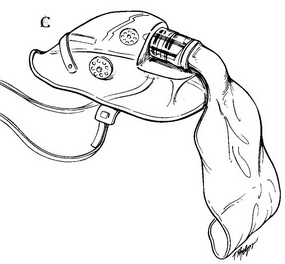 ภาพที่ 2. อุปกรณ์ให้ออกซิเจน A. ท่อออกซิเจนผ่านจมูก B. หน้ากากครอบหน้าแบบไม่มีถุงลมเสริม C. หน้ากากครอบหน้าชนิดมีถุงลมเสริมพร้อมลิ้นปรับลมหายใจไม่ให้วนกลับ