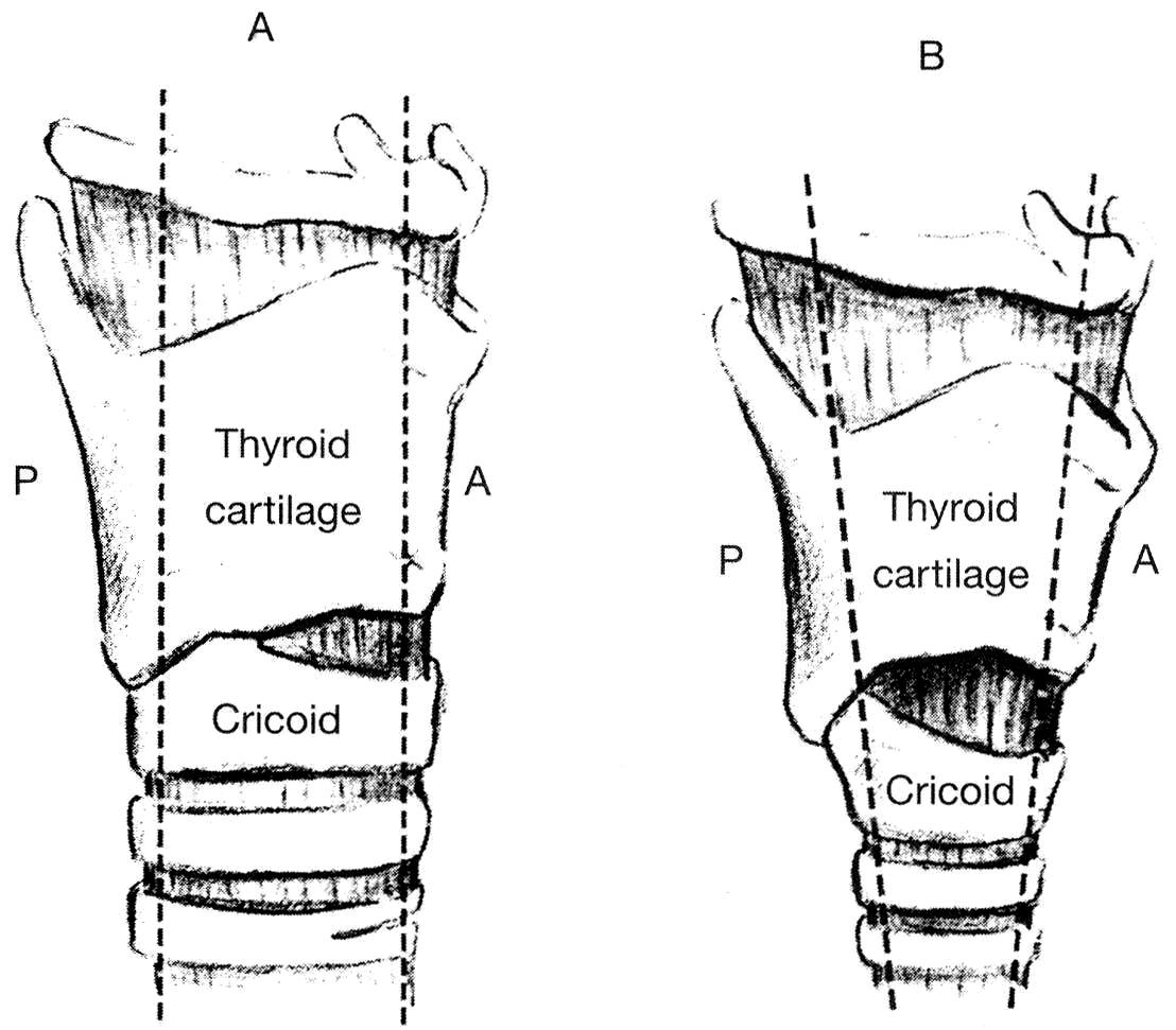 5. ลักษณะท่อทางเดินหายใจส่วนบนของเด็กที่มีลักษณะเป็นรูปกรวย โดยส่วนที่แคบที่สุดอยู่ที่ตำแหน่ง subglottic ในขณะที่ทางเดินหายใจส่วนบนของผู้ใหญ่มีลักษณะเป็นทรงกระบอก ส่วนที่แคบที่สุดอยู่ที่ตำแหน่งของกล่องเสียง (ภาพที่ 1) การที่ทางเดินหายใจของเด็กมีลักษณะเป็นรูปกรวย เมื่อมีการบวมที่บริเวณ subglottic เพียงเล็กน้อยก็จะทำให้ความต้านทานทางเดินหายใจเพิ่มขึ้นหลายเท่า และเกิดภาวะอุดกั้นทางเดินหายใจส่วนบนได้โดยง่าย.