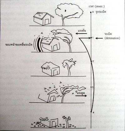 3. ลมระเบิด (blast wind) ทำให้เกิดการบาดเจ็บขั้นสาม (tertiary blast injury) คือผู้ป่วยถูกลมระเบิดผลักให้ล้มลง หรือปลิวไปกระแทกกับกำแพง/ต้นไม้/ของแข็งอื่นๆ มีความแรงและความเร็วน้อยกว่าคลื่นระเบิดมาก. (ภาพที่ 3)