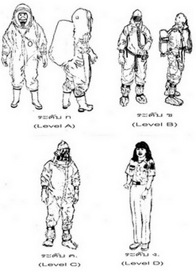 ระดับ ก. (level A) ป้องกันได้สูงสุด มีชุดกันสารเคมีคลุมหมดทั้งตัว (fully encapsulating chemical resistant suit) และมีชุดหายใจเอง (Self-Contained Breathing Apparatus, SCBA)