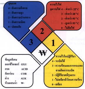 ตัวอักษรในส่วนสีขาว = ข้อมูลพิเศษเกี่ยวกับสารเคมีนั้น