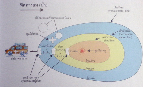 และป้องกันการแพร่กระจายสารพิษไปยังผู้อื่น จนบุคลากรเหล่านี้สามารถใช้ PPE ในระดับ ก. และ ข. (ภาพที่ 12) ได้อย่างชำนาญก่อนเกิดเหตุ และรู้วิธีนำผู้ป่วยออกจากจุดอันตราย (จุดเกิดเหตุ) มาถอดเสื้อผ้า และล้างพิษด้วยน้ำและสบู่ ฯลฯ ได้อย่างถูกต้องก่อนนำ ผู้ป่วยออกจาก "โซนร้อน" มาส่งต่อให้บุคลากรใน "โซนอุ่น" ล้างพิษและปฐมพยาบาล ก่อนส่งต่อให้แพทย์และพยาบาลใน "โซนเย็น" เพื่อล้างพิษต่อ และ/หรือให้การรักษาพยาบาลขั้นต้นต่อไป (ภาพที่ 15).