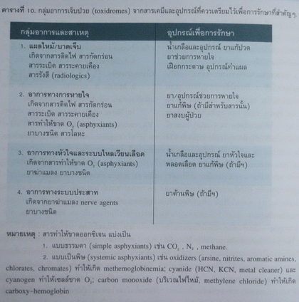 สารเคมีส่วนใหญ่จะทำให้เกิดอาการป่วยสำคัญๆ เป็น 4 กลุ่ม และอุปกรณ์ที่ควรเตรียมไว้เพื่อการรักษาอาการเหล่านั้น ได้แสดงไว้ในตารางที่ 10.