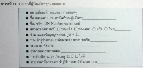 6. รีบหาว่าสารพิษนั้นคืออะไร โดยสอบถามจากผู้เกี่ยวข้องโดยเฉพาะในสถานที่เกิดเหตุ เช่น ชื่อ ชนิด และ/หรือ UN Number ของวัตถุอันตราย แล้วสอบถามศูนย์พิษวิทยา (รามาธิบดี โทรศัพท์ 1367 หรือ 0-2201-1083 หรือ 0-2354-7272 และศิริราช โทรศัพท์ 0-2419-7007 หรือ 0-2419-7317 ซึ่งให้บริการตลอด 24 ชั่วโมง) ถึงยาต้านพิษ (antidote) และวิธีการรักษาอื่นๆ.