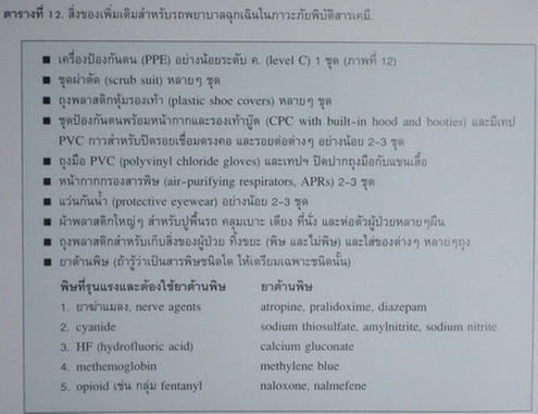 ก่อนออกรถ ตรวจดูว่ามีสิ่งของเพิ่มเติมสำหรับภาวะภัยพิบัติสารเคมีดังตารางที่ 12 ครบถ้วน (นอกจากสิ่งของอื่นๆ ที่มีอยู่เป็นประจำในรถพยาบาลฉุกเฉิน).